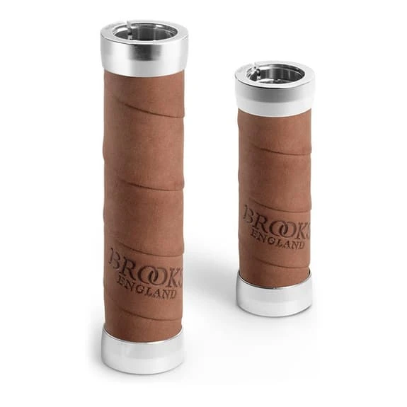 The Brooks England Slender 100-130 mm leather cuffs are made of vegetable tanned leather and cork tape, and are designed to offer an alternative to the Plump cuffs. At the same time they maintain the sustainability standard offering the possibility of replacing the worn parts if necessary. Its design incorporates an aluminum casing around which the tape is wrapped in the traditional way, like any handlebar tape. The skin is then held in place by means of aluminum and steel clamps that can be removed in the event that the tape requires replacement. The tape is made with the same leather as the Brooks England saddles.