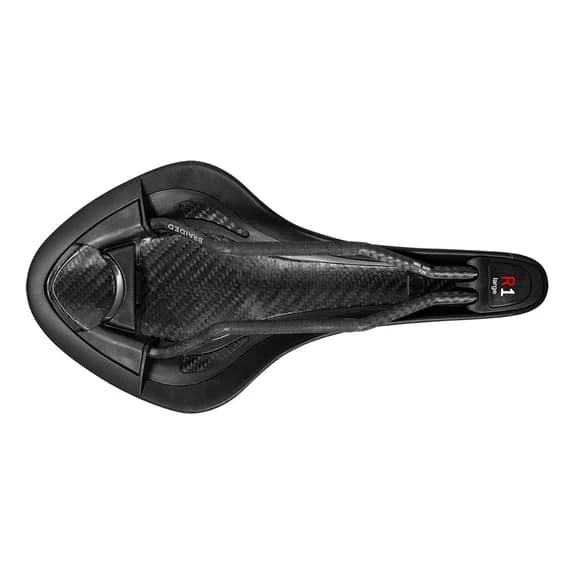 The Fizik Arione R1 Large saddle has a carbon structure that offers the best support with an optimization of rigidity. This model offers comfort to cyclists who demand lightness and flexibility. It is a flat saddle model with a narrow front area. It has a carbon fiber shell with nylon injection that allows flexibility in the part of contact with the thighs.